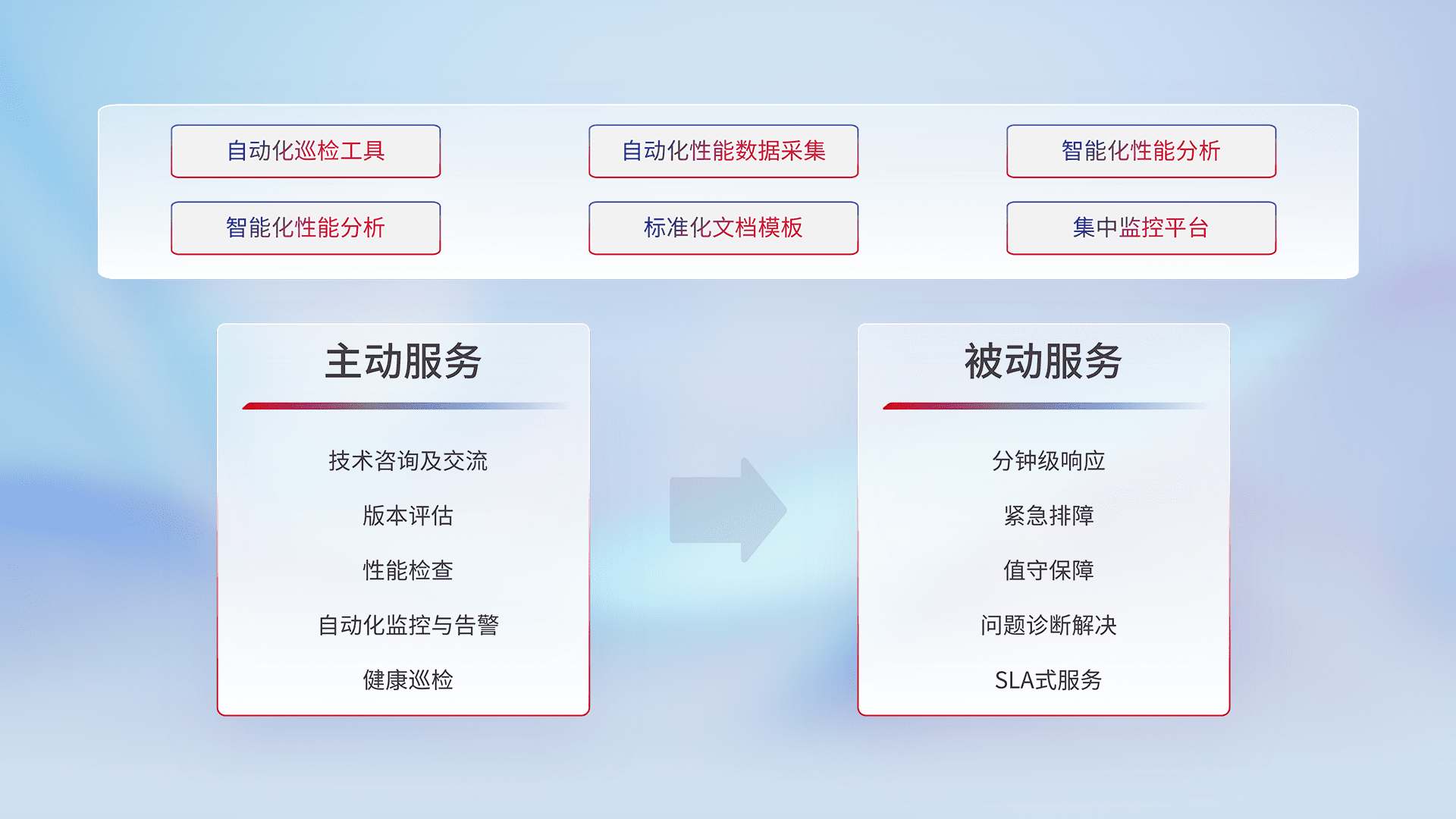 智能化工具和标准化文档,,,保障服务质量,,提供主动服务(包含技术咨询、、、、版本评估、、性能检查、、自动化监控与告警、、健康巡检)和被动服务包含(分钟级响应、、紧急排障、、值守保障、、、、问题诊断解决、、SLA服务)。。。。
