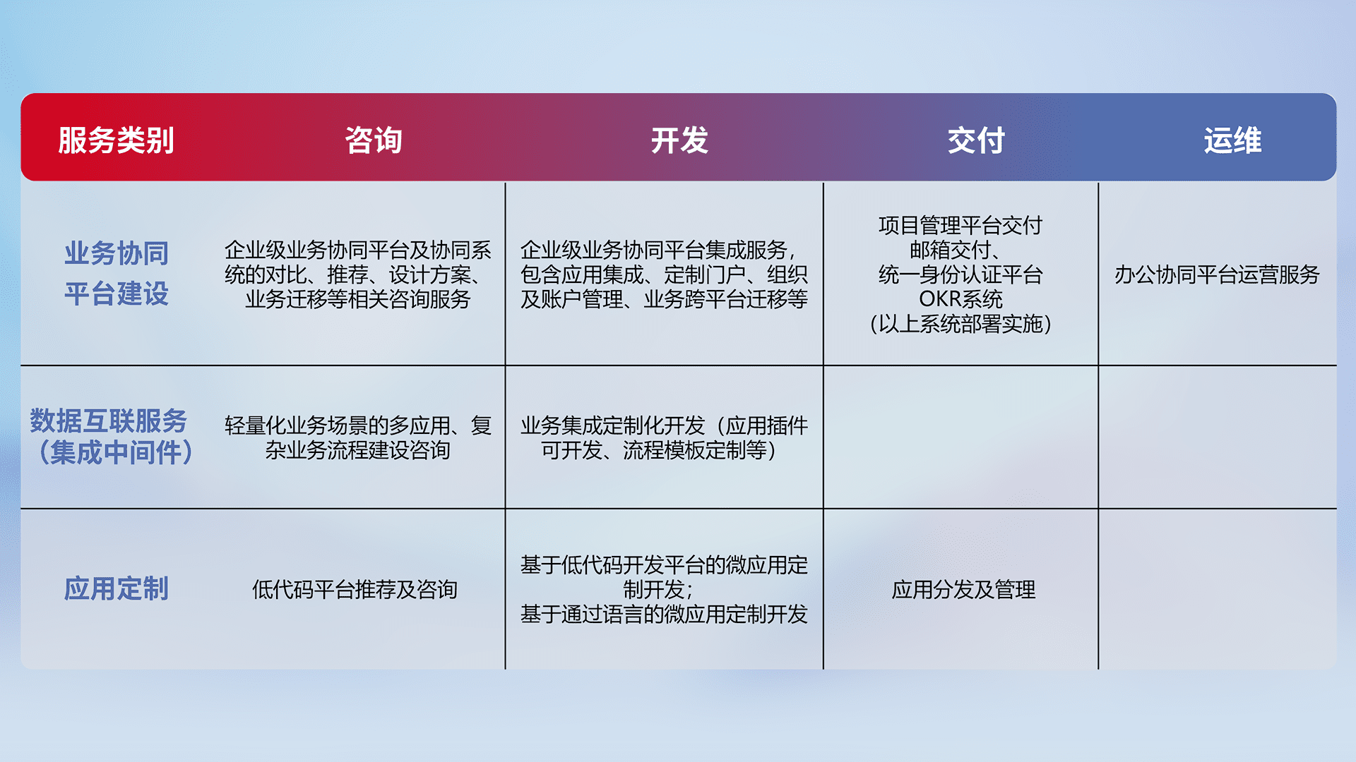 针对钉钉、、企微、、、IDaas等平台级产品提供产品的规划、、、方案、、交付、、定制化开发等服务,,,实现如统一协同办公、、、智能客户服务、、、、混合会议管理、、、、智能数据查询、、、、等业务场景,,,,实现数字化转型。。。。